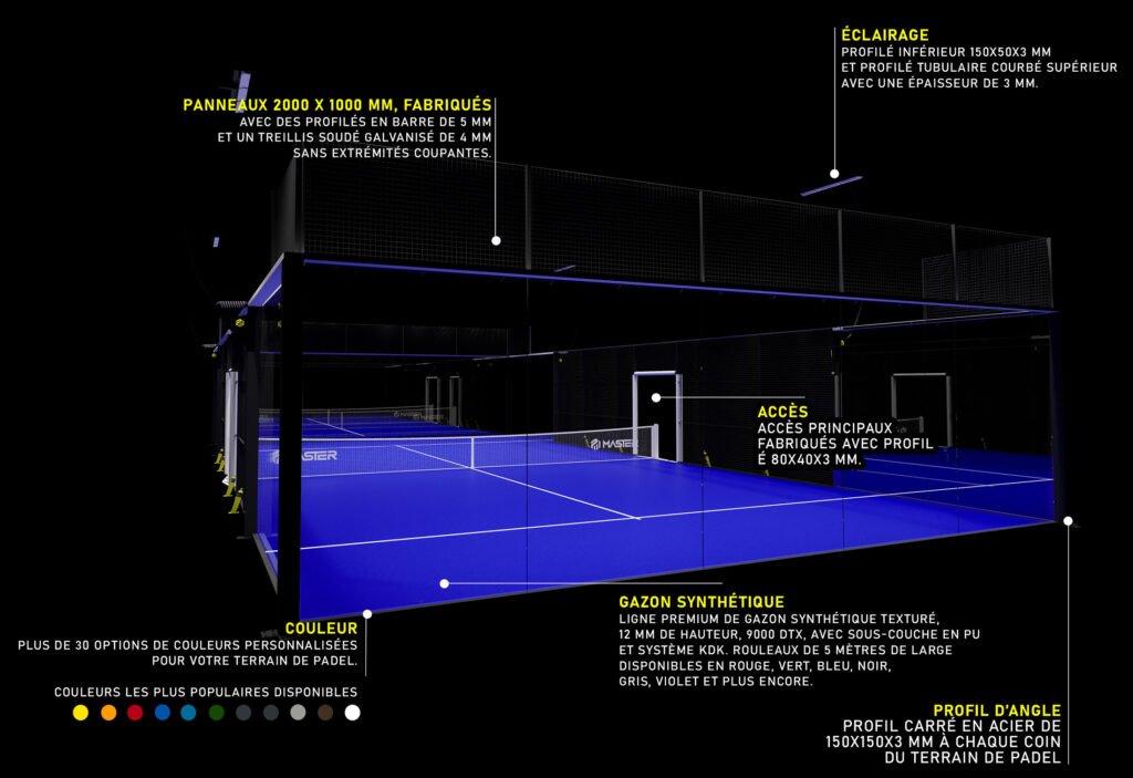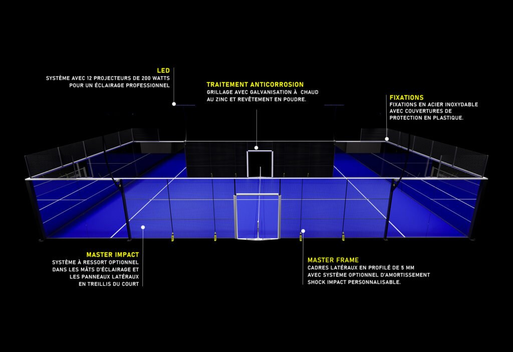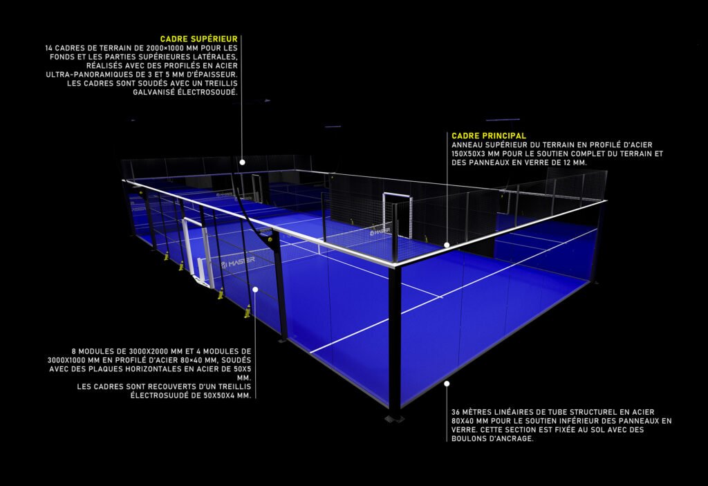 18 vitres trempées de 12 mm, conformes aux normes de la Fédération Internationale de Padel.